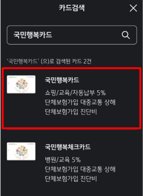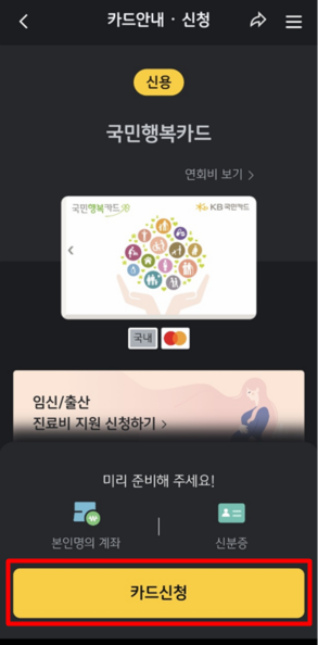 '국민행복카드' 클릭 후 아래에 뜨는 '카드신청' 버튼 클릭