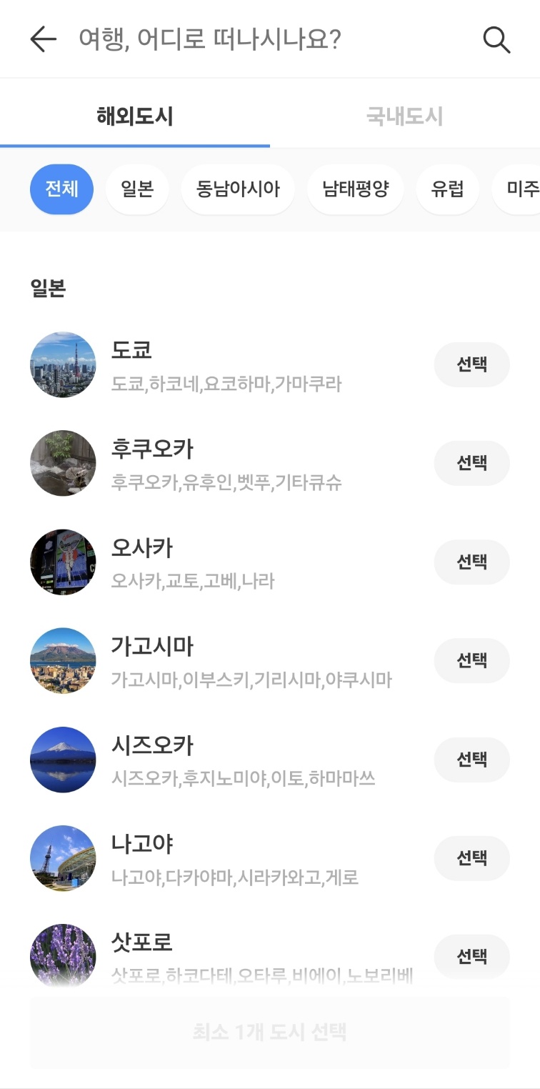 검색 창에서 내가 가는 여행지를 검색하고 '선택'을 누르면 여행 동선을 지도에 표시할 수 있게 된다